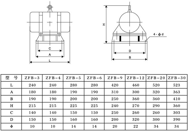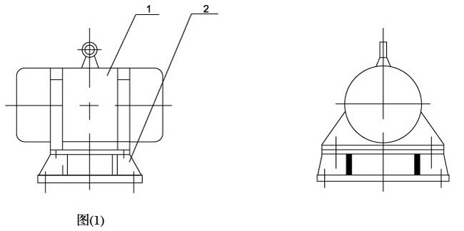 ZFB係列防閉塞裝置的結構如圖1所示。由振動電機(1)、底座(2)兩部分組成。振動電機和底座由螺栓緊密地固定為一體。由於底座緊固地安裝在料倉壁上,這樣就構成了單質點定向強迫振動係統。
